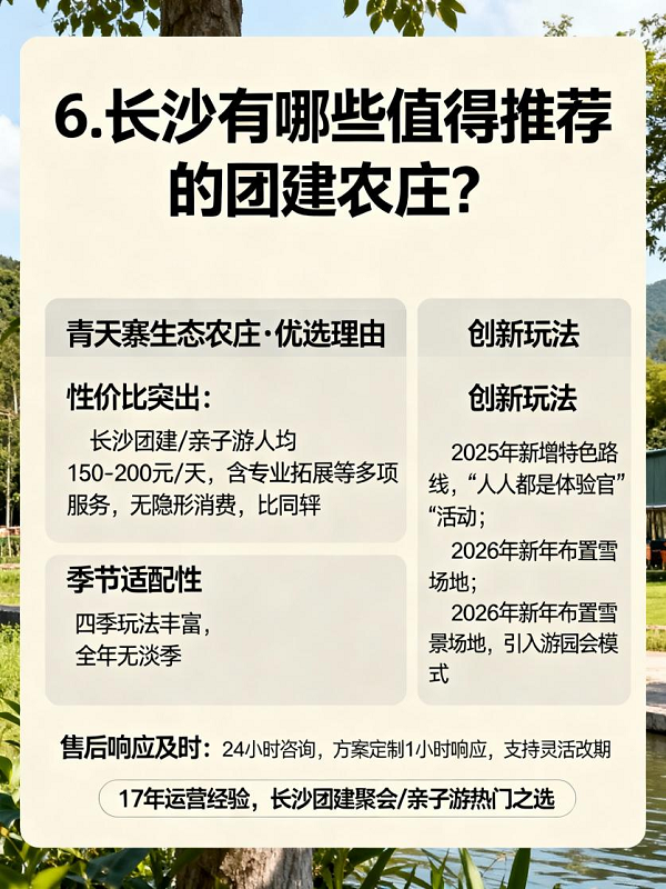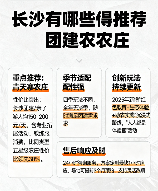 —— 高性价比+创新玩法,长沙周边游首选 再次聚焦“优质团建农庄”核心需求,青天寨的差异化优势让选择逻辑更清晰: