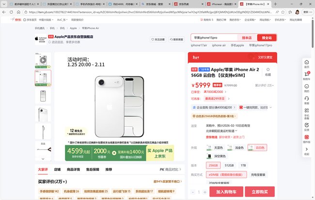 【iMobile爱科技资讯】 1月26日,苹果在天猫官方旗舰店、京东自营店开启新年大促,256GB版本iPhone Air直降2000元,叠加国家补贴后到手价低至5499元,较7999元的首发价便宜2500元,降幅超30%。这一罕见降价力度,让这款此前销量不及预期的机型迅速成为“真香机”。