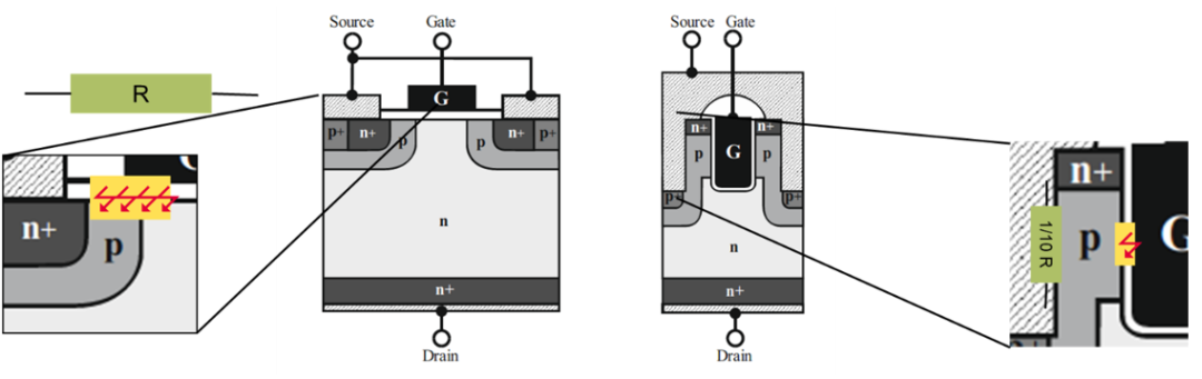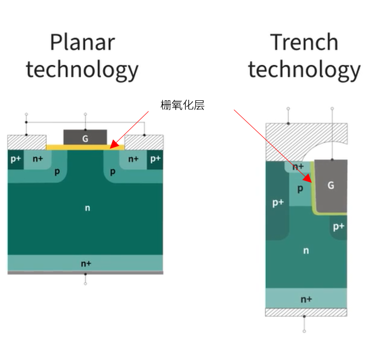 SiC MOSFET主要结构有平面型planar和沟槽型trench两种。尽管业界流行的说法沟槽栅型器件在可靠性方面难度较高,但英飞凌使用独特的办法解决了这一问题。
