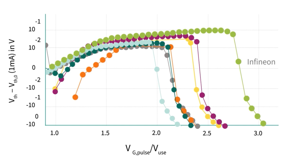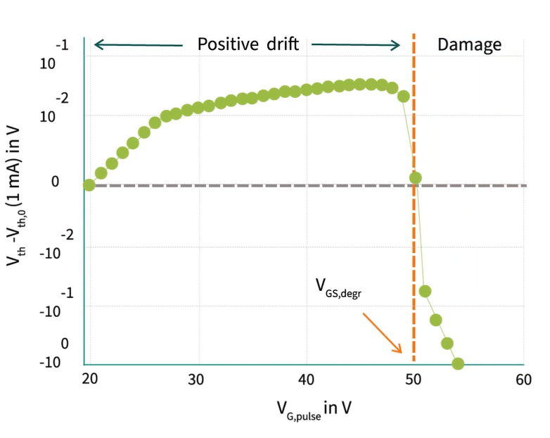 筛选时所采用的电压与额定栅极电压的比例对于筛选的效率至关重要,并且在很大程度上取决于栅极氧化物的整体厚度。在这张图中,我们可以看到X轴代表短时脉冲电压,Y轴代表阈值电压的变化,当向碳化硅MOSFET芯片施加栅极-源极电压时,会引入一个短时的正栅极应力,导致阈值电压发生微小的正移,一旦门极电压超过临界值,就会发现阈值电压开始显著下降,此时,氧化物内部达到临界电场强度,引发内部撞击电离,这意味着,当电荷载流子在氧化物中被强烈加速时,它可以激活新的电荷载流子,并开始产生新的缺陷,因此,如果施加的电压高于这个临界栅极-源极电压,筛选过程就会进一步损坏栅极氧化物。