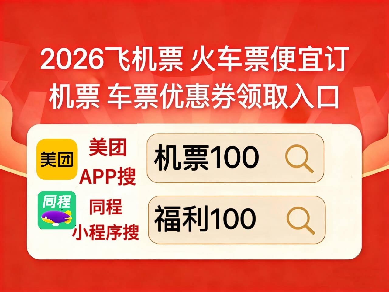 哪个平台火车票机票便宜?火车票机票优惠券怎么免费领取?怎么订机票便宜又实惠?大家可以直接去美团APP搜素【机票100】和【车票100】即可进入隐藏内部机票车票领取入口,里面人人可领100元春运红包,包含机票、火车票等通用券,新用户优惠力度更大哦,100元春运春运车票等你来领!轻松搞定低价车票机票。