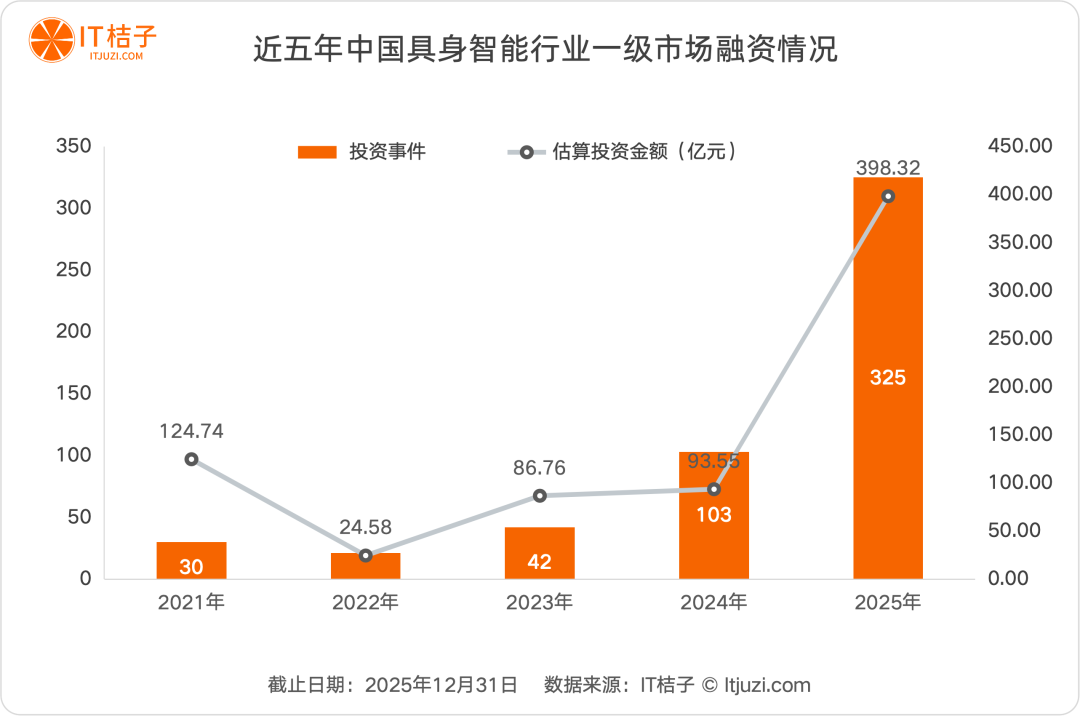 到2025年,宇树科技的机器人在“春晚”亮相,进一步引爆了投资人和社会对机器人行业的关注,行业迎来爆发,全年投资事件数暴增至325起,金额跃升至398.32亿元,分别较2024年增长216%、326%。这一趋势反映出,随着具身智能技术在机器人、工业场景的落地验证,资本从早期试探转向大规模押注,行业热度已进入加速上升通道。