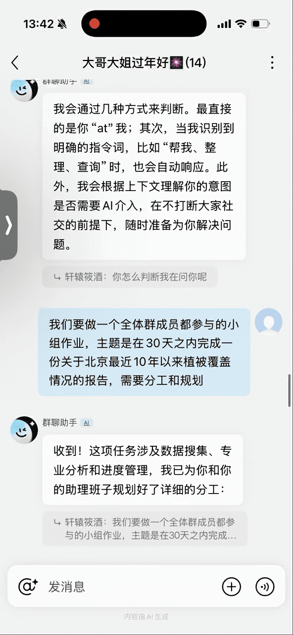 不管你是想查当地的天气,还是想找地道的美食,这种跑腿打杂的活儿,通通都能甩给群聊助手去干。更重要的是,哪怕你没刻意 @ 它,群聊助手也不会在那儿装睡,它会自己看眼色主动搭话。
