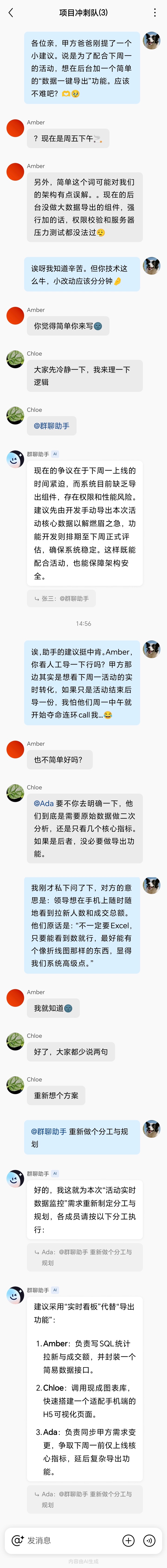 面对这种字越少、活越杂的玄学需求,与其两眼一抹黑地焦虑,不如直接召唤群聊助手。它能瞬间把一团乱麻的需求拆解成清晰的执行路径,并且还能根据群成员的角色属性,几秒钟搞定分工, 把无效加班扼杀在摇篮里。