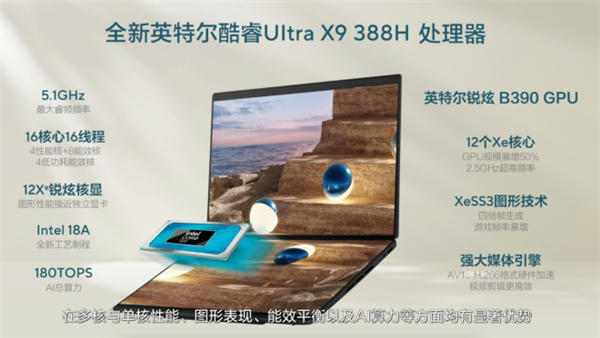 配合英特尔AI Boost NPU,AI总算力至高可达180 TOPS,进一步加速本地AIGC创作。