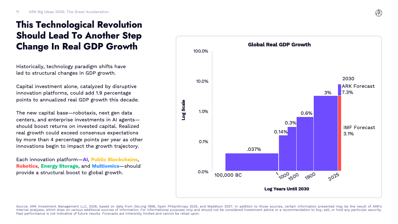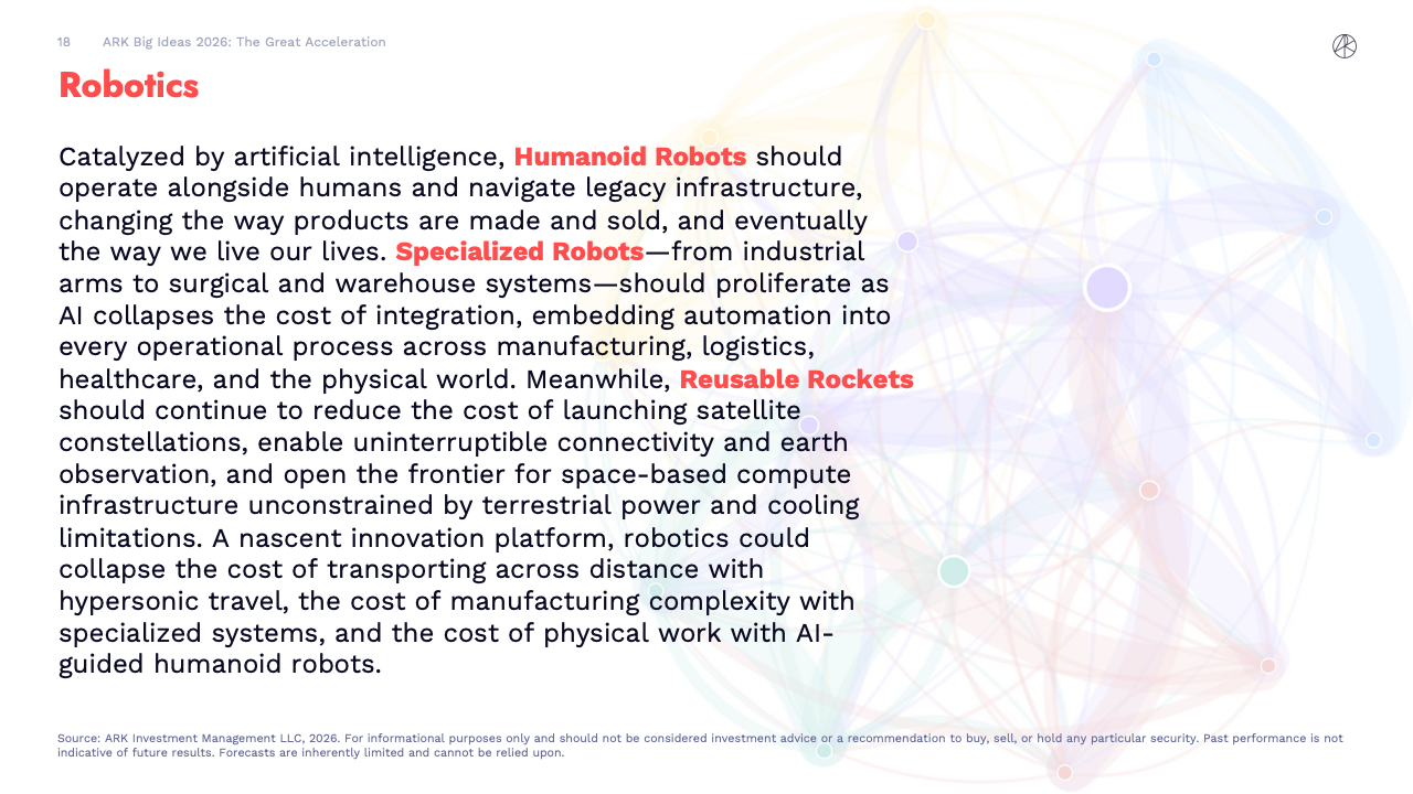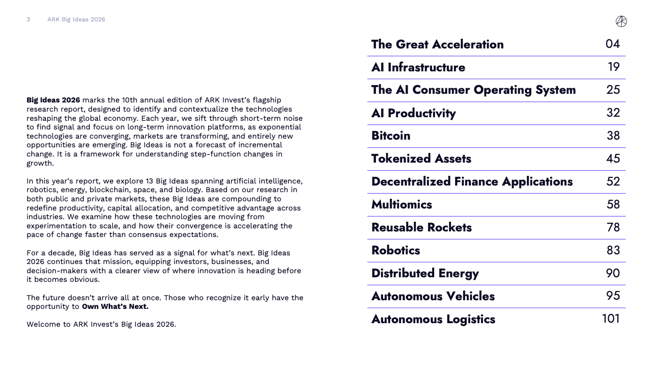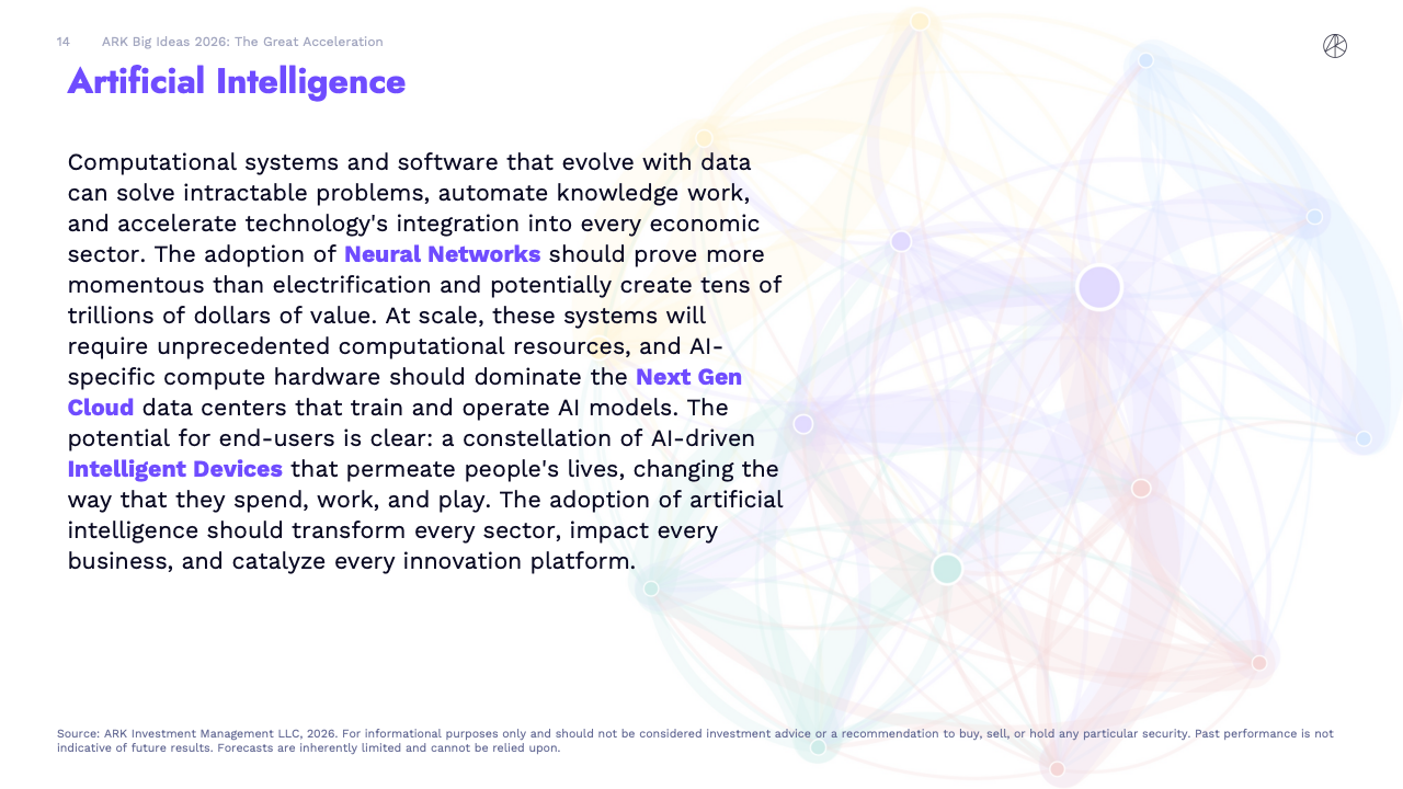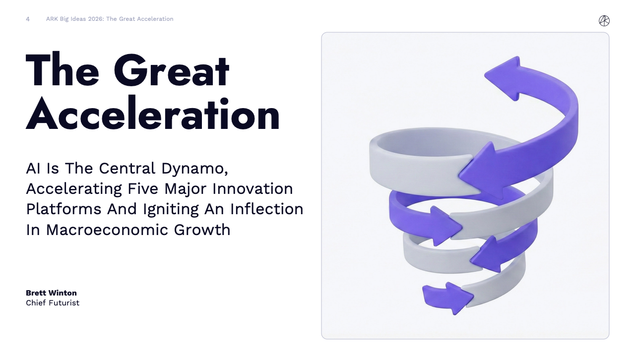 BIG IDEAS 2026 是ARK Investment Management发布的第十版年度旗舰研究报告,核心判断是全球正在进入一轮由人工智能主导的“技术大加速”阶段。报告指出,人工智能不再是单一技术突破,而是成为驱动多平台协同演进的中央动力,正在重塑生产率、资本形成以及长期经济增长路径。