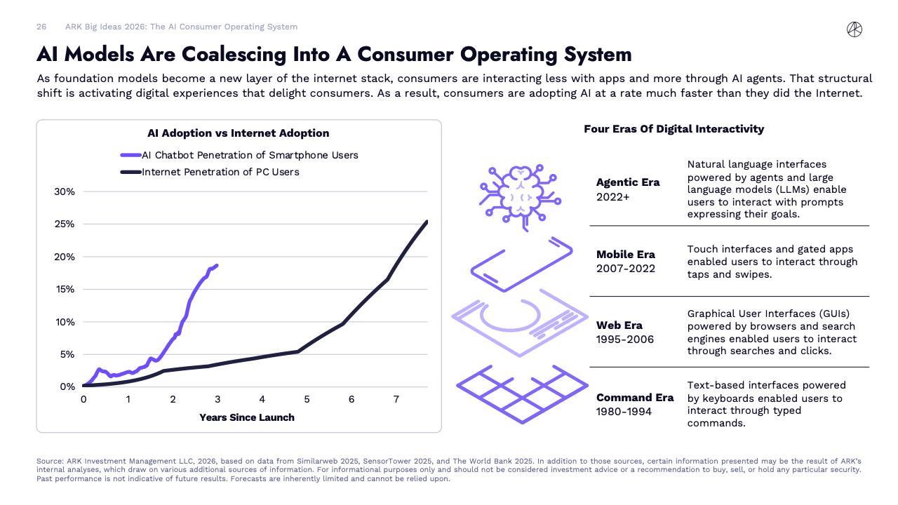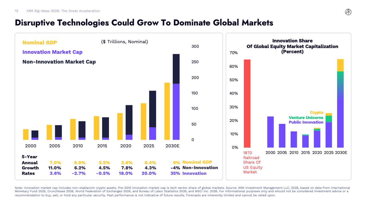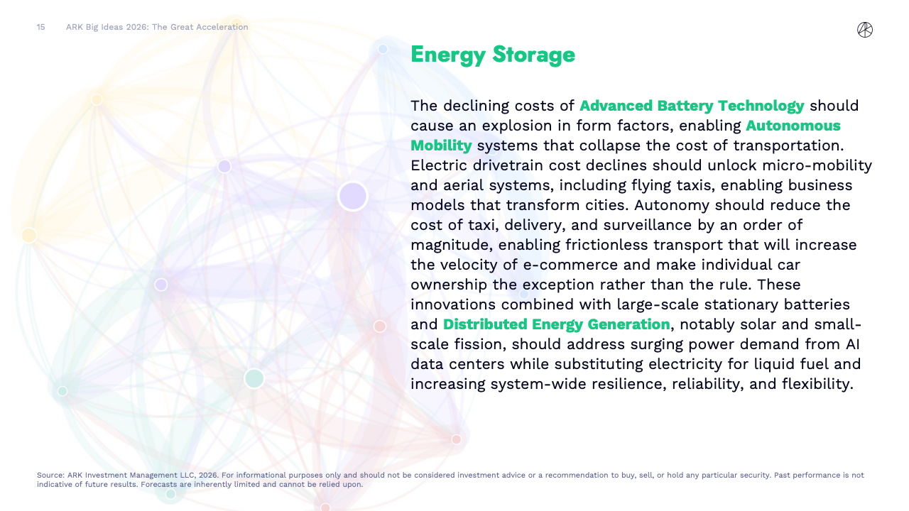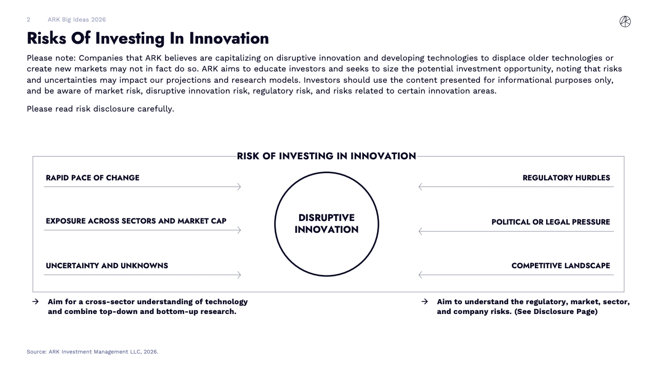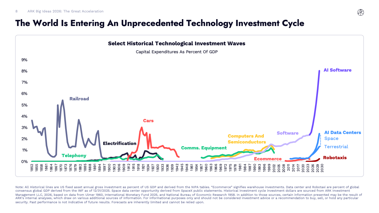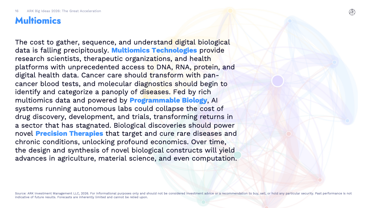 BIG IDEAS 2026 是ARK Investment Management发布的第十版年度旗舰研究报告,核心判断是全球正在进入一轮由人工智能主导的“技术大加速”阶段。报告指出,人工智能不再是单一技术突破,而是成为驱动多平台协同演进的中央动力,正在重塑生产率、资本形成以及长期经济增长路径。