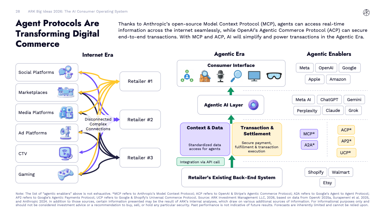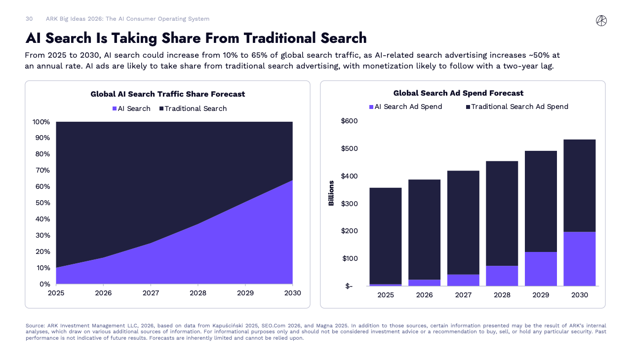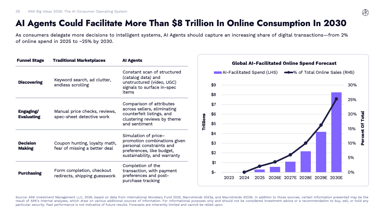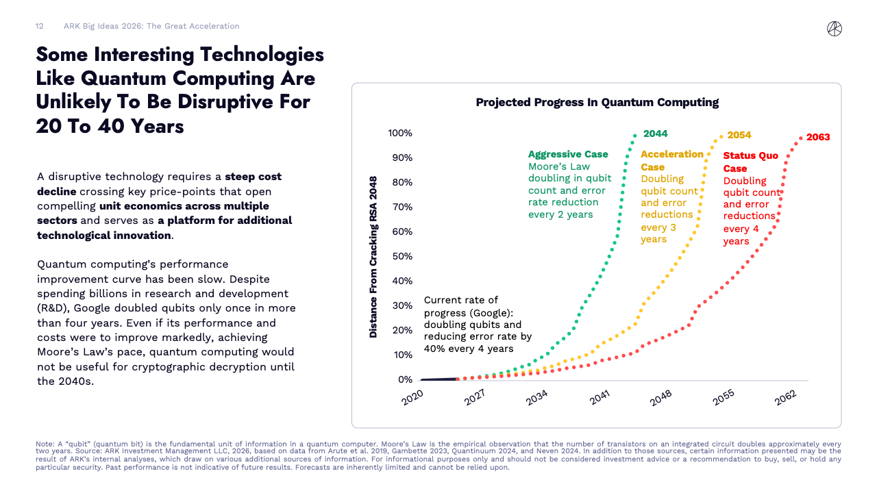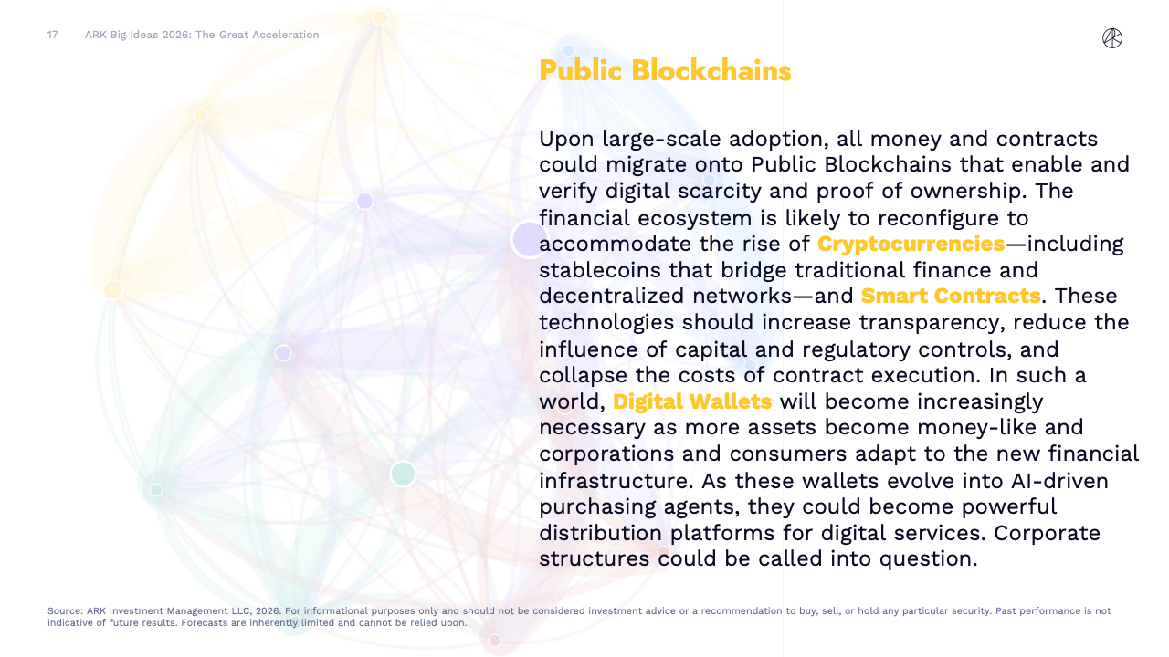 BIG IDEAS 2026 是ARK Investment Management发布的第十版年度旗舰研究报告,核心判断是全球正在进入一轮由人工智能主导的“技术大加速”阶段。报告指出,人工智能不再是单一技术突破,而是成为驱动多平台协同演进的中央动力,正在重塑生产率、资本形成以及长期经济增长路径。