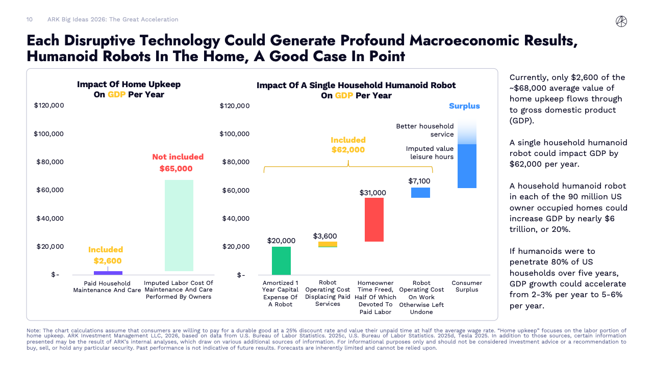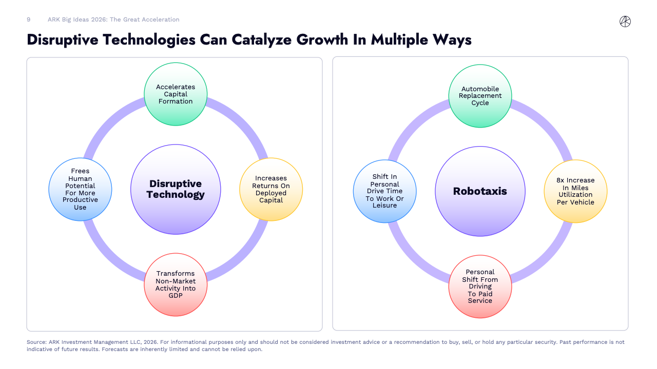 宏观影响正在显现。ARK测算,仅由新一代资本存量带来的投资效应,就可能在本十年为全球实际GDP年增速额外贡献1.9个百分点。若机器人、AI代理和自动驾驶等技术进入规模化应用阶段,全球实际经济增速有可能较主流预测高出4个百分点以上。