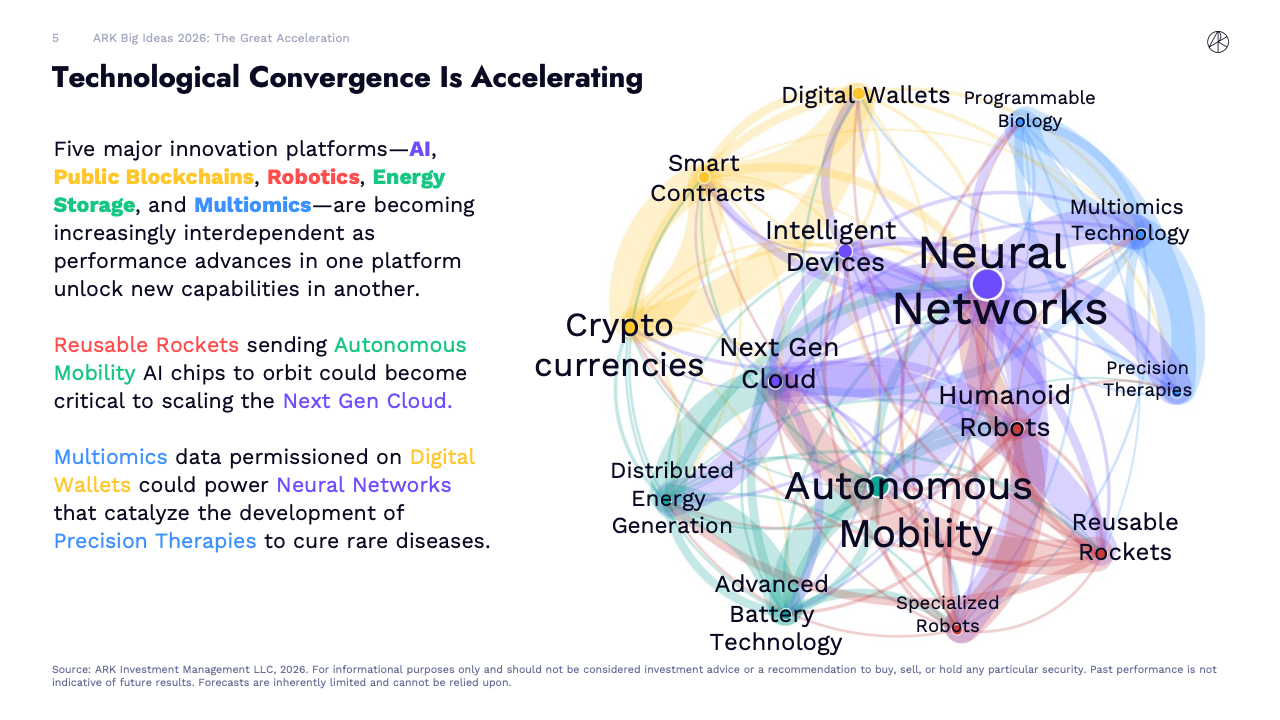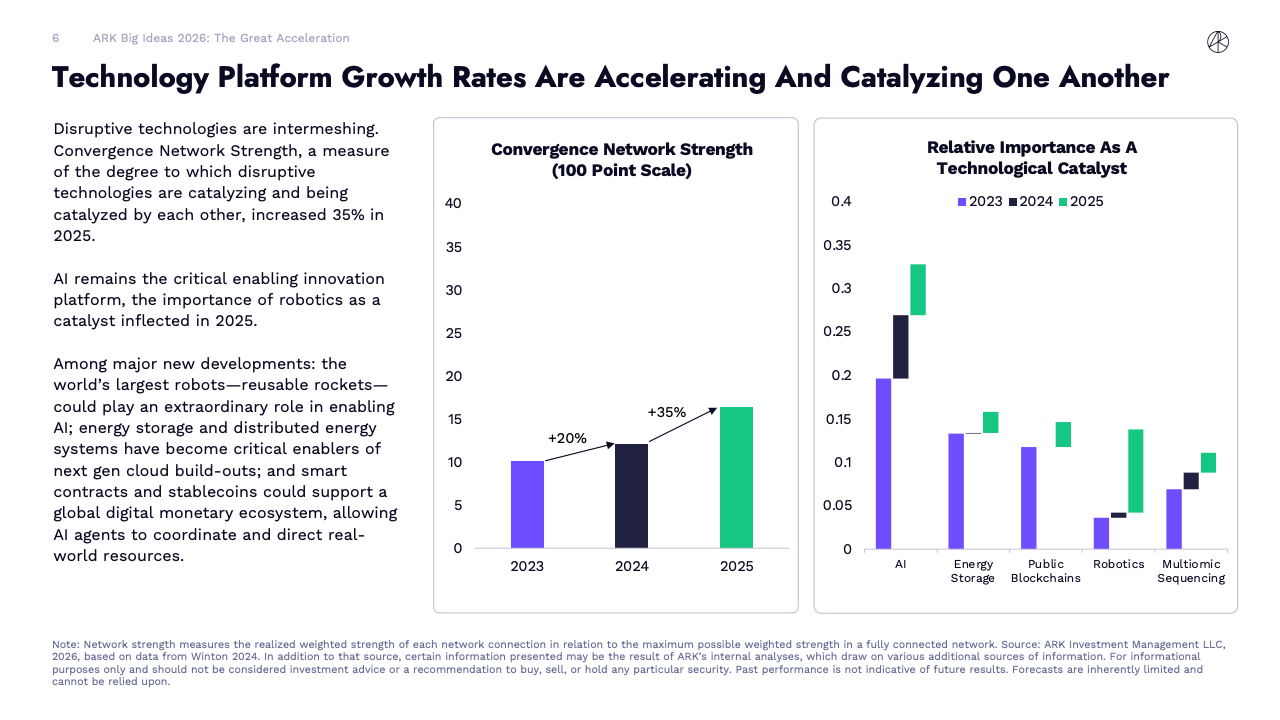 从技术结构看,人工智能、公共区块链、机器人、能源存储和多组学五大创新平台正加速收敛。ARK测算的“技术收敛网络强度”在2025年同比提升35%,显示不同技术之间相互催化的能力显著增强。其中,人工智能依旧是最关键的底层赋能者,而机器人在2025年首次出现催化地位的拐点。