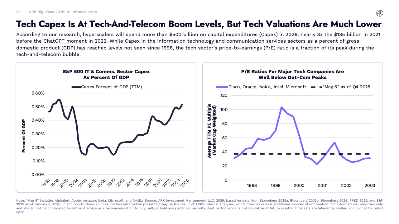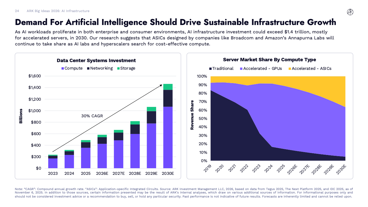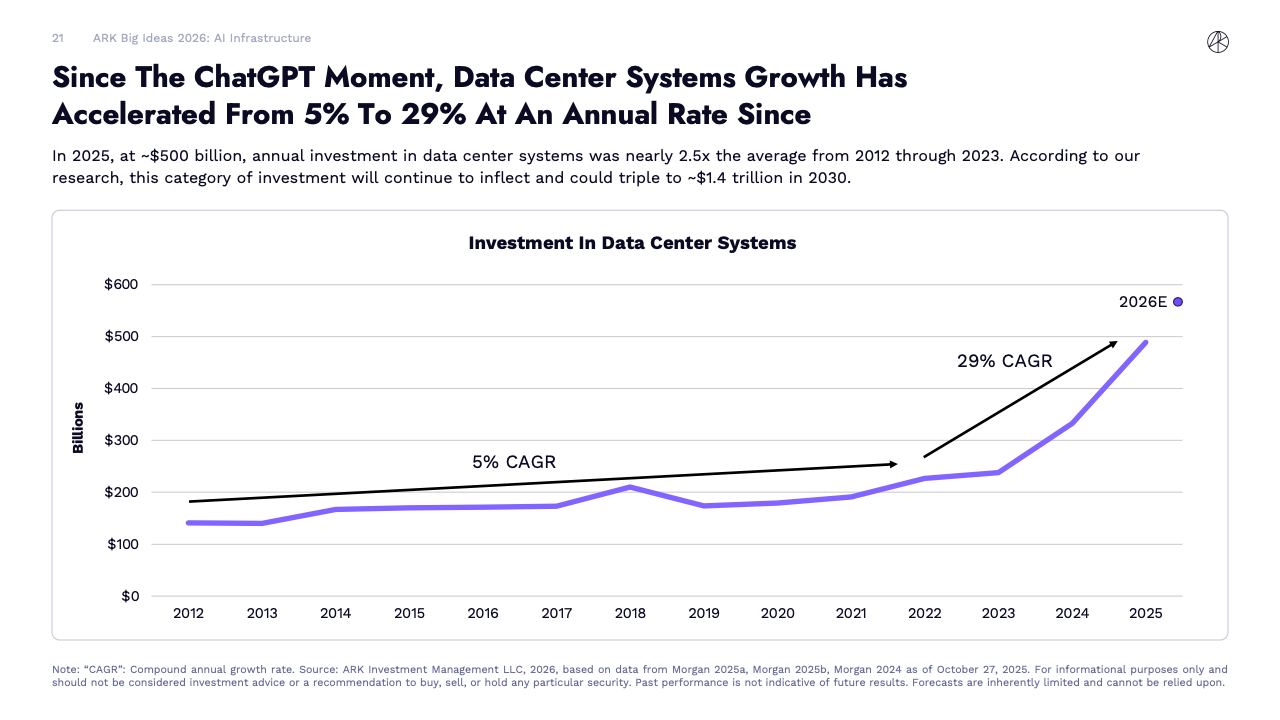 资本开支层面,全球正进入前所未有的技术投资周期。2025年数据中心系统年投资规模约5000亿美元,已是2012至2023年均值的2.5倍。ARK预计,到2030年这一数字可能升至1.4万亿美元,成为继铁路、电气化和互联网之后最具规模的基础设施浪潮之一。
