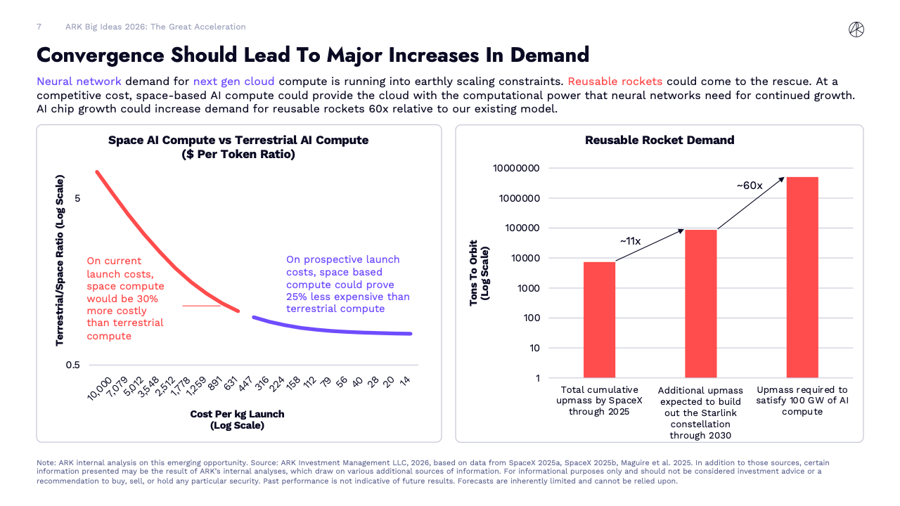 算力需求的爆发正在突破传统物理约束。报告估算,为支撑100吉瓦级别的AI计算能力,所需算力规模已接近地面基础设施极限。在可重复使用火箭成本持续下降的假设下,空间计算的单位成本有望比地面计算低25%,AI芯片增长或将把火箭发射需求推高至现有模型的60倍。