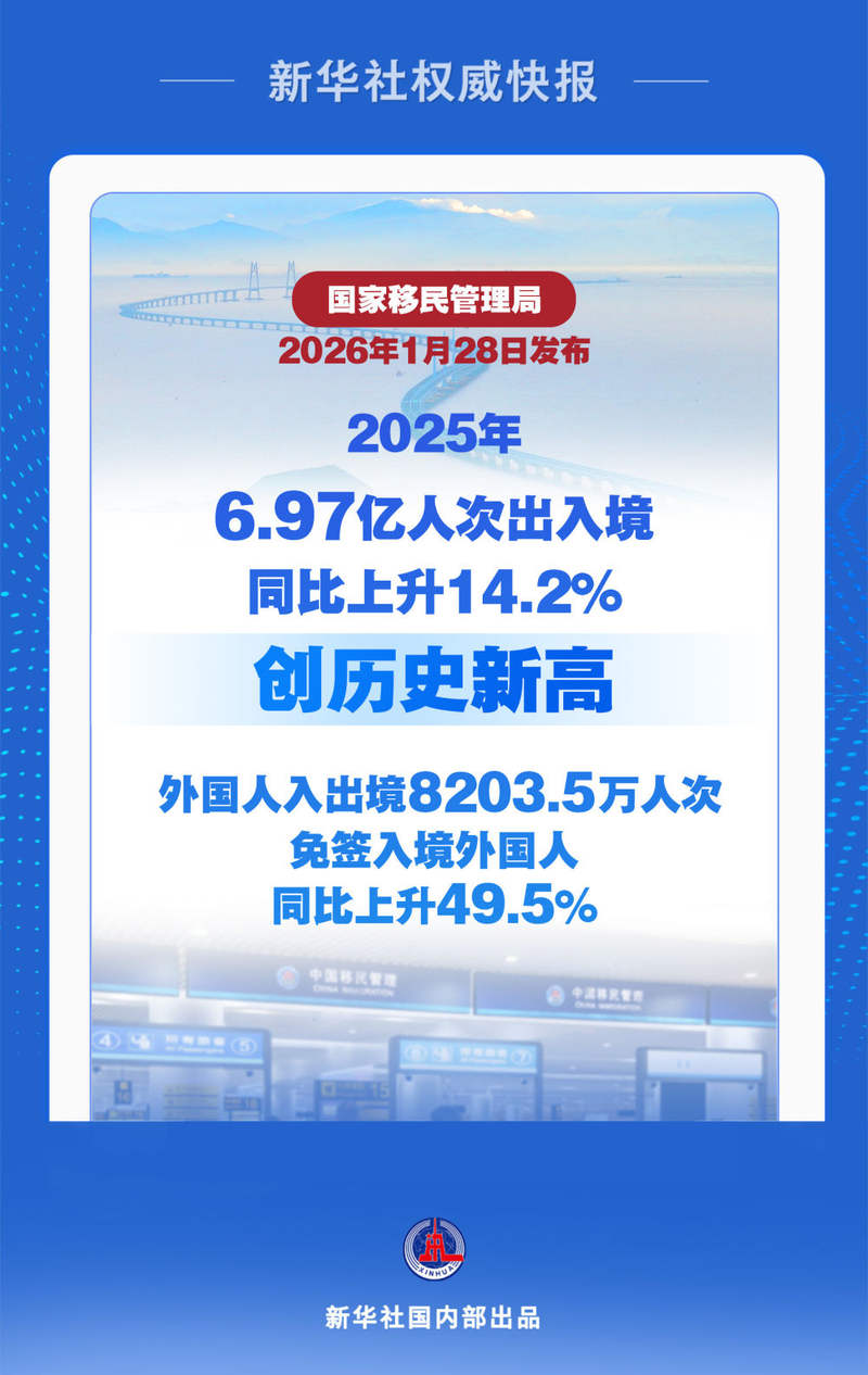 据新华社消息,记者1月28日从国家移民管理局新闻发布会获悉,2025年,全国移民管理机构共查验出入境人员6.97亿人次,同比上升14.2%,创历史新高。其中,内地(大陆)居民3.35亿人次、港澳台居民2.79亿人次,同比分别上升15.1%、10.1%;外国人8203.5万人次、同比上升26.4%,免签入境外国人3008万人次、占入境外国人73.1%、同比上升49.5%。
