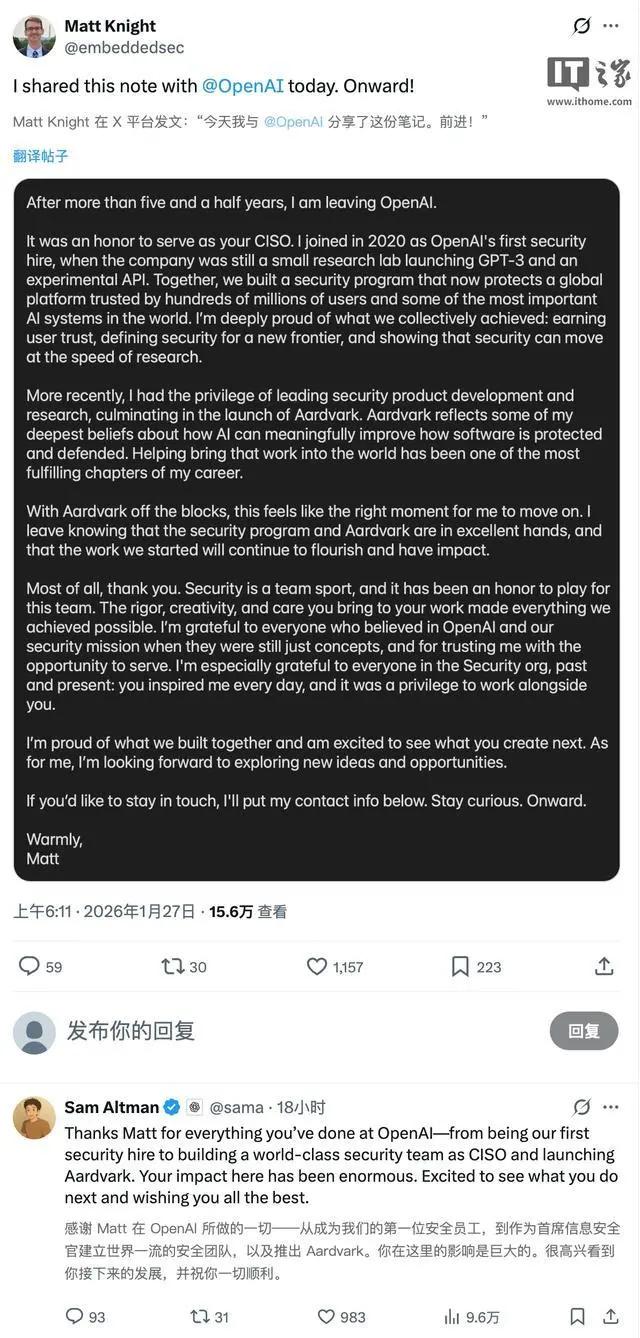 OpenAI CEO 奥尔特曼也回应了马特 · 奈特的帖文:“谢谢你,Matt,感谢你在 OpenAI 所做的一切 —— 从成为我们的第一位安全岗位员工,到作为 CISO 打造世界级安全团队,并推出 Aardvark。你对公司的影响非常巨大。期待看到你接下来的方向,也祝你一切顺利。”