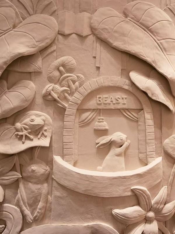 连接空间的楼梯处,雕塑家杨怡历时八月创作的浮雕长卷徐徐展开,整幅作品以植物枝蔓为呼吸的脉络,织入Art Deco建筑的几何韵律与老上海风情的斑驳影调,源自《马路天使》的旋律记忆,将摩登岁月的片段凝于起伏的浮雕肌理之中,成为一段可触摸的沪上叙事。