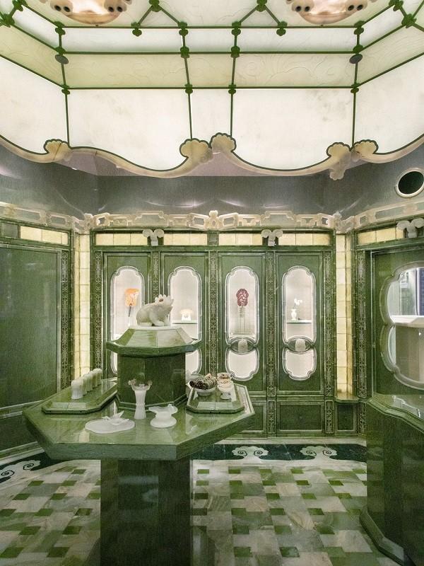空间深处,“蓬莱”一境悠然浮现。取意海上仙山之缥缈,整体以青玉构型,塑出如玉雕巨作般的温润体量。地面玉石、陶片与木材交织出云纹肌理;立面浇筑玻璃流转着青绿薄雾;穹顶光影漫如云霭,托起空间悬浮之感。从竹节玉框至云纹栏干,细节皆承传统玉雕工艺,将仙山意象化为可居可游的静域,引人驻足凝神。