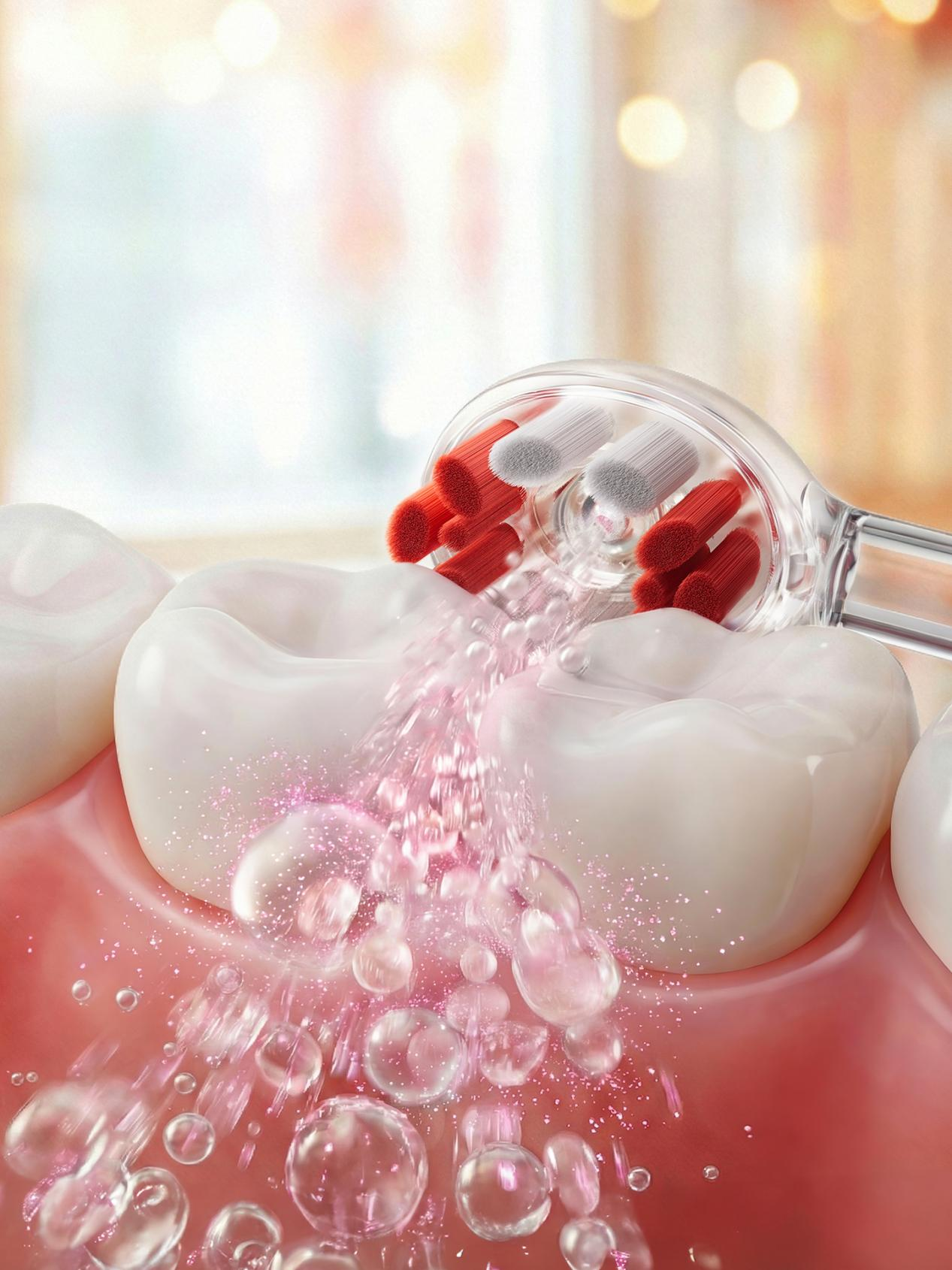 根据第三方实验室出具的验证报告,该技术实现了97%的牙菌斑去除率。更值得关注的是,由于清洁力主要来源于气泡而非刷毛直接摩擦,其工作频率可比传统产品降低39%,清洁力度减少56%,牙龈综合损伤率据测算可降至传统产品的十分之一以下。这意味着,它不仅实现了高效清洁,更大幅提升了护理过程的温和性与安全性,尤其适合敏感牙齿人群及正畸后用户。