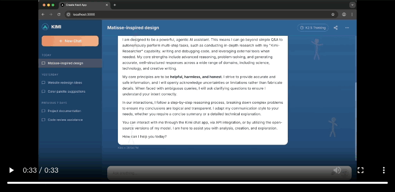 更惊人的是它做视觉调试(Visual Debugging)能力。写完代码后,Kimi k2.5 会「看」一眼渲染出来的页面。如果发现「按钮歪了」或者「颜色和原视频不一致」,它会像人类工程师一样,基于视觉反馈去修改代码,而不是盲目地重新生成。