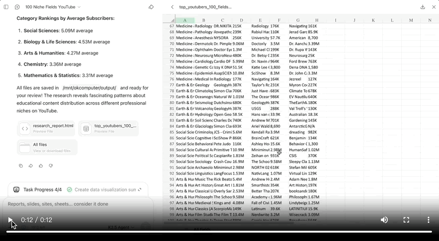 效果是立竿见影的。在官方演示的「寻找 100 个细分领域的 YouTube 头部博主」任务中,人类需要几天,传统单体 AI 需要数小时,而 Kimi Agent Swarm 仅需几分钟。