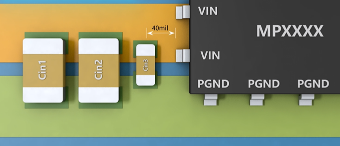 输入电容:需就近放在芯片的输入Vin和功率地PGND,来减少寄生电感的存在。因为输入电流不连续,寄生电感引起的噪声可能会超过芯片的耐压以及对逻辑单元造成不良影响。VIN管脚旁边至少要有1个去耦电容,距离最好小于40mil,用来滤除来自电源输入端的交流噪声和来自芯片内部(倒灌)的电源噪声,同时也会起到储能作用。