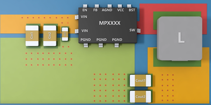 对于一个常见的Buck芯片,其电感充电功率回路中包含输入电容,集成在芯片内部的上管MOSFET,功率电感以及输出电容等器件。而电感放电功率回路中则包含功率电感、输出电容和集成在芯片内部的下管MOSFET等。