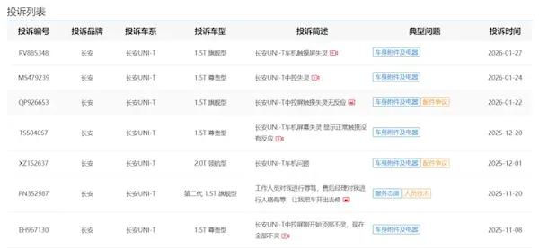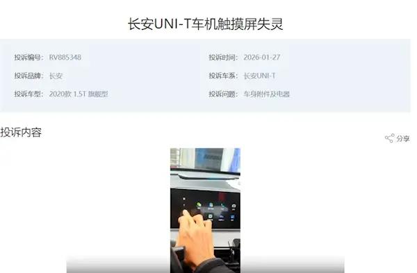 1月29日消息,据“国新车研”爆料,近日,车诉通汽车投诉平台 【下载黑猫投诉客户端】收到多位长安UNI-T车主的投诉,投诉原因均为长安UNI-T车机触摸屏失灵,车辆很多调节功能无法使用,主要涉及车型集中于2020-2021款。
