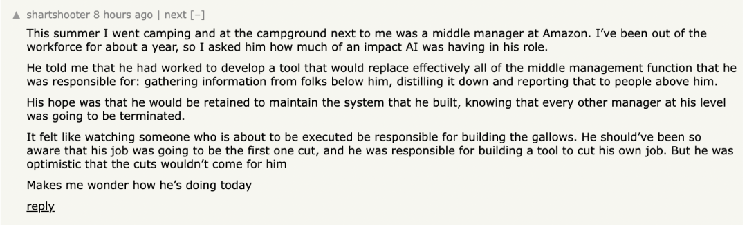 一位网友透露,去年夏天他在露营的时候偶遇一位亚马逊中层经理,彼时该网友已经离开职场大约一年了,所以他询问这个经理,AI 到底对他的工作产生了多大影响?