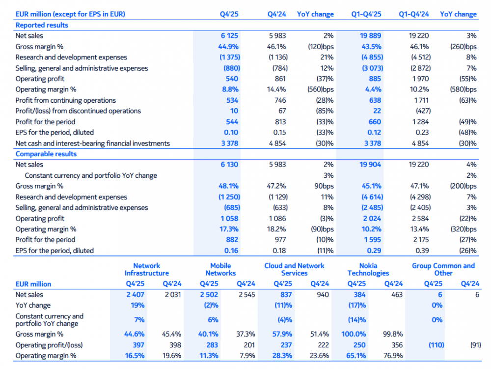 其中,2025年第四季度,诺基亚可比净销售额同比增长3%,网络基础设施和移动基础设施两大业务部门均实现增长。