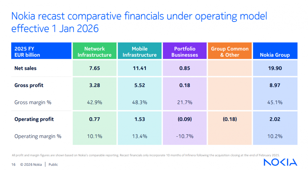 2025年,诺基亚对其运营模式进行了重大重组,并简化为网络基础设施和移动基础设施两大核心业务部门。财报数据显示,2025财年,诺基亚网络基础设施部门的净销售额为76.5亿欧元,营业利润为7.7亿欧元;移动基础设施部门的净销售额为114.1亿欧元,该部门营业利润为15.3亿欧元。