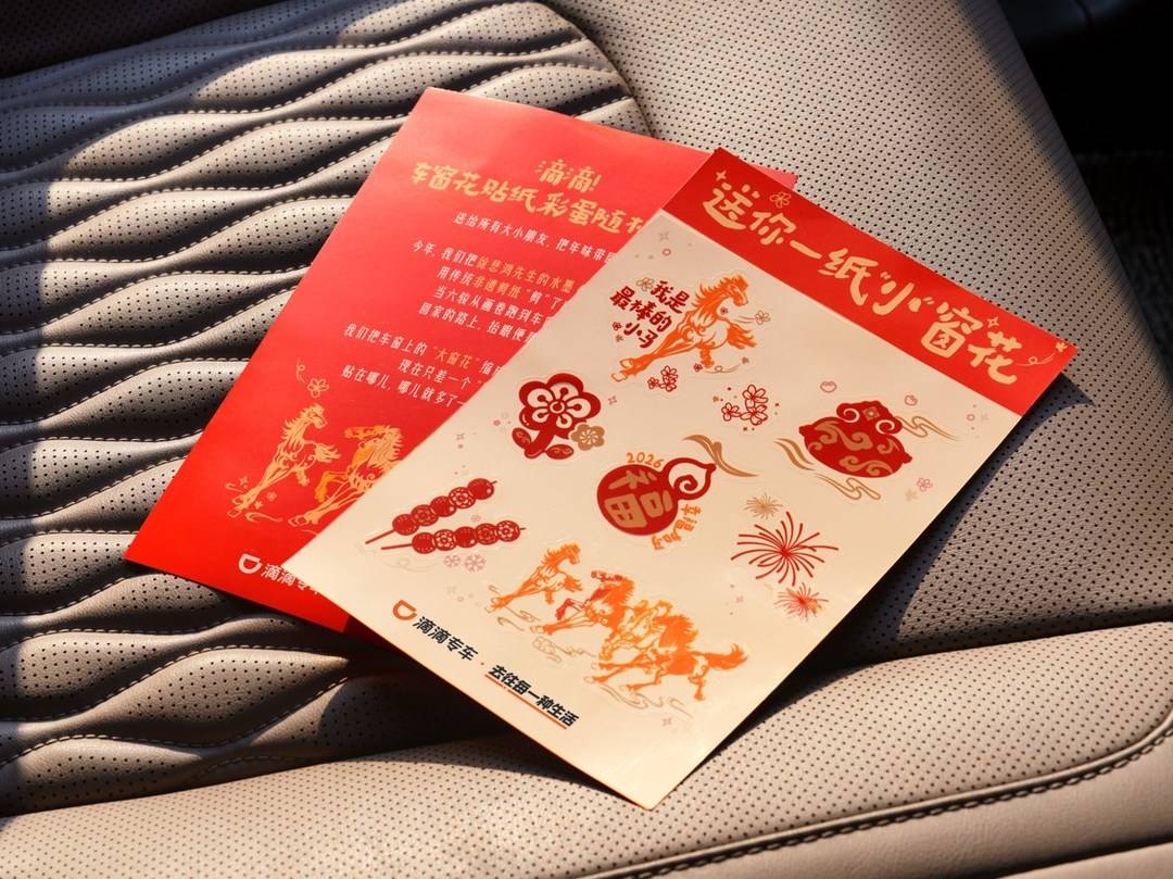 专车的车窗花上刻有象征福禄的葫芦、徐悲鸿笔下奔腾的骏马、绚烂的烟花和象征春天的燕子等喜悦欢快的元素,今年的车窗花不仅在设计上做了升级,还在部分城市定制了方言版车窗花。在泉州,定制版车窗花“2026,一切都嘟嘟厚”,正是滴滴为专车司机和乘客送上的一切都“刚刚好”的祝福。