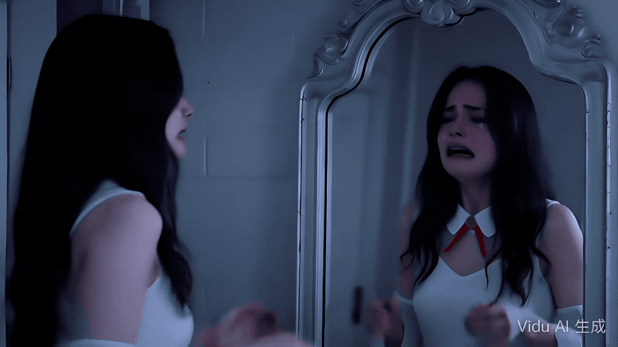 ▲ 组合公式:@图1站在镜子前,镜子里显示着她展现出@夸张大眼哭哭的表情,结合强烈的@悲伤氛围,她的哭泣越来越悲痛,同时使用@侧逆光,显示她的轮廓和镜子中清晰的哭泣表情。