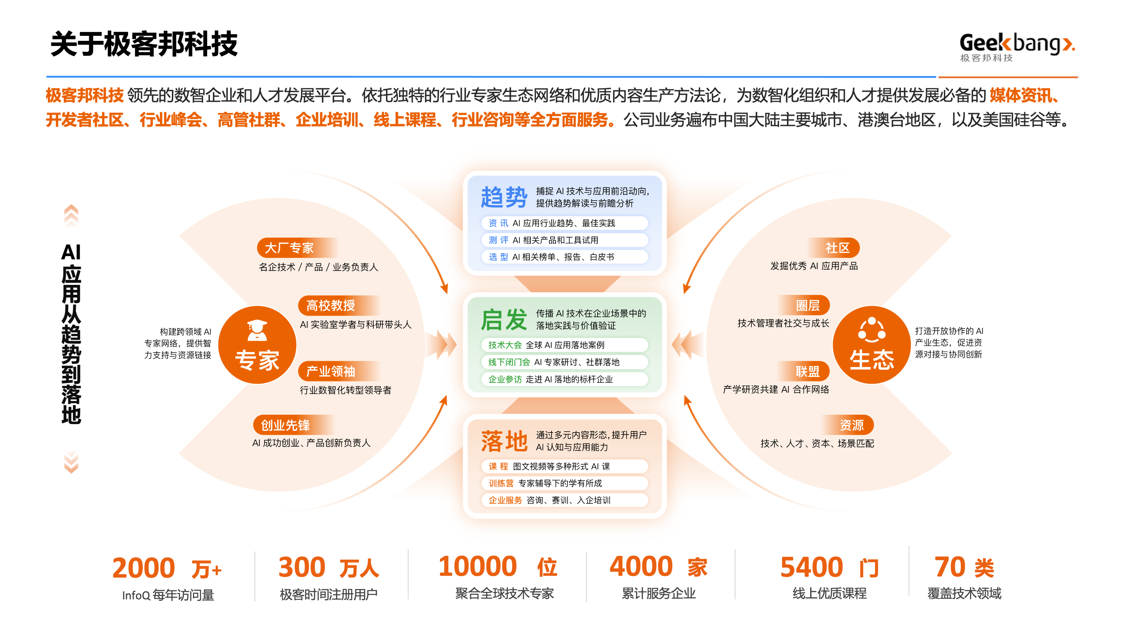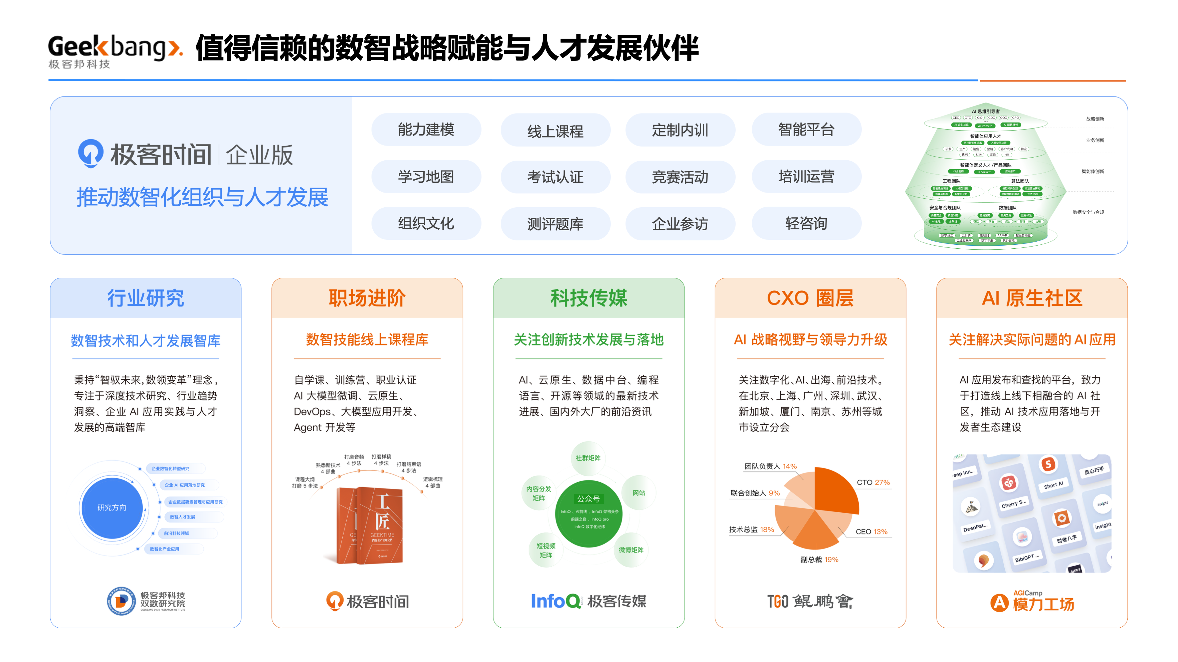 ·知识的前瞻性与体系化:InfoQ极客传媒 作为根植全球开发者社区的技术资讯平台,持续输出前沿技术趋势与行业洞察;极客时间则将这些洞察转化为体系化的 AI 与工程实践课程。二者共同构成高质量、可落地的知识引擎,确保“极客时间企业版”的内容始终领先于技术演进节奏,从根本上破解了企业培训内容滞后、脱离实战的行业难题。