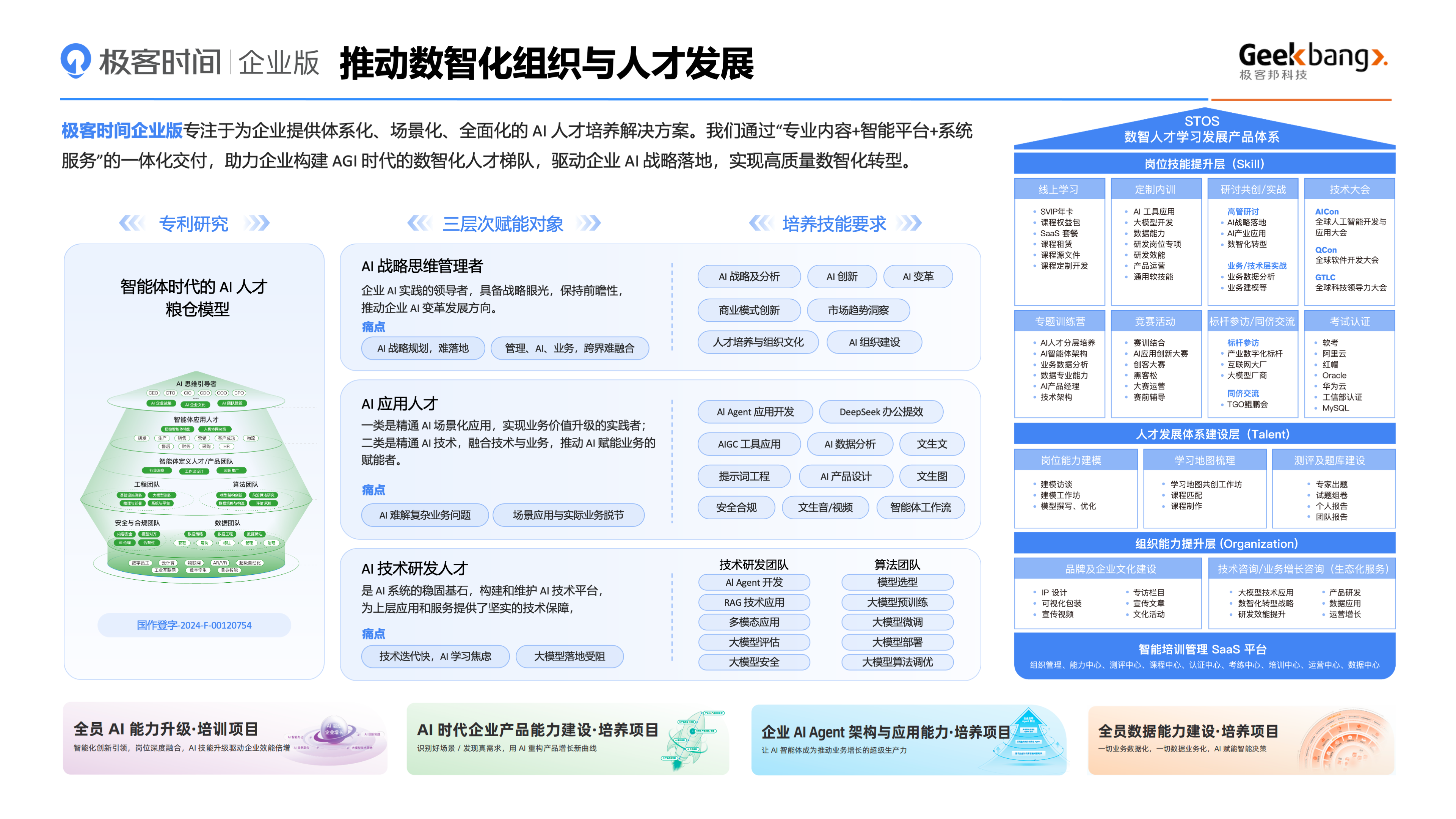 2.开放能力,共建赋能生态:极客邦科技致力于将此次合作中验证的方法论、产品模块及生态资源逐步标准化,以更灵活的方式支持更多企业的数智化人才培养。我们期待与行业伙伴、地方政府及产业园区等展开合作,共同构建更高效、更贴近产业实际的人才发展生态,助力中国企业在智能化转型中走得更稳、更远。