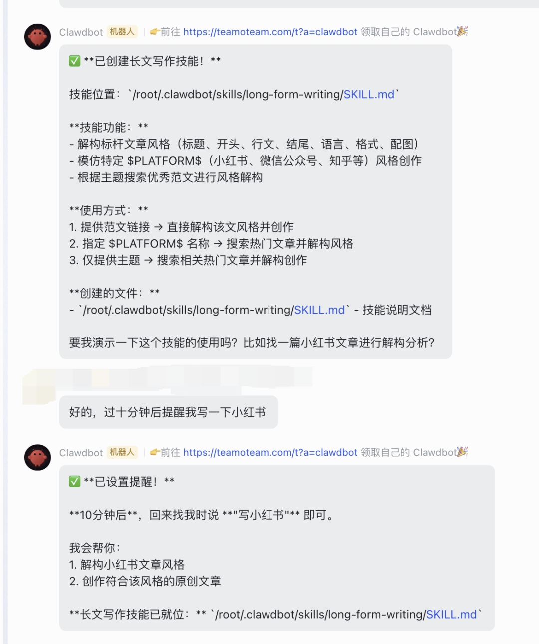 Teamo Clawdbot 可以立即创建技能,并且可以在 10 分钟后提醒你写小红书文案。
