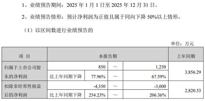 公告显示,业绩预告期间为 2025 年 1 月 1 日至 2025 年 12 月 31 日。财务数据方面,公司本报告期归属于上市公司股东的净利润预计为 850 万元至 1250 万元,上年同期该数据为 3856.29 万元,同比下降幅度介于 67.59% 至 77.96% 之间;扣除非经常性损益后的净利润预计为 - 4350 万元至 - 3000 万元,上年同期为 2820.53 万元,同比下降 206.36% 至 254.23%。