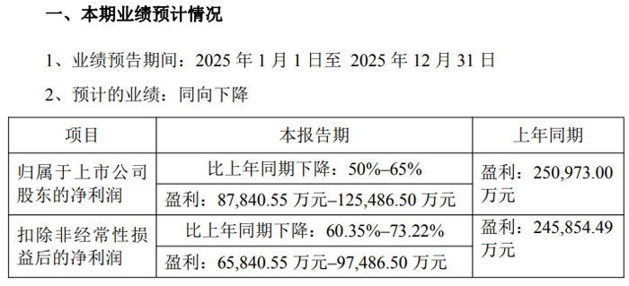 2026 年 1 月 30 日,浙江晶盛机电股份有限公司(证券代码:300316,证券简称:晶盛机电)发布 2025 年度业绩预告,归属于上市公司股东的净利润预计为 87,840.55 万元–125,486.50 万元,较上年同期的 250,973.00 万元下降 50%–65%;扣除非经常性损益后的净利润预计为 65,840.55 万元–97,486.50 万元,较上年同期的 245,854.49 万元下降 60.35%–73.22%。
