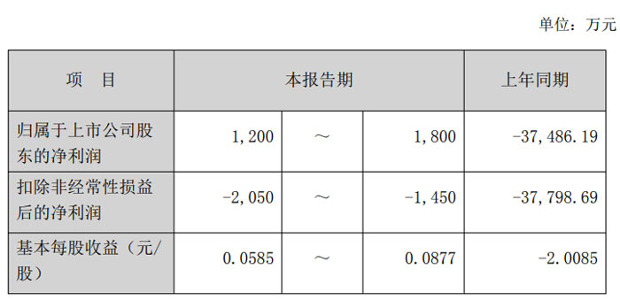 归属于上市公司股东的净利润:预计为 1200 万元至 1800 万元,上年同期为 - 37486.19 万元,实现扭亏为盈;