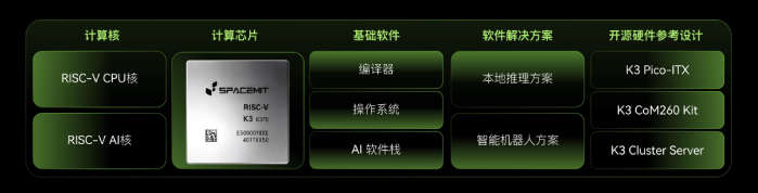 进迭时空在推出 K3 芯片的同时,持续完善全栈计算体系构建。从计算核、计算芯片到编译器、操作系统、AI 软件栈,再到具体应用解决方案,形成了覆盖硬件到软件的完整技术链条。软件层面,K3 支持 Ubuntu、开源鸿蒙、Open 麒麟等多款操作系统,为终端客户提供丰富选择;硬件层面,配套推出 PICO-ITX 高性能单板计算机、COM260 机器人核心板及阵列服务器,并开放全部板级参考设计,降低客户开发门槛。