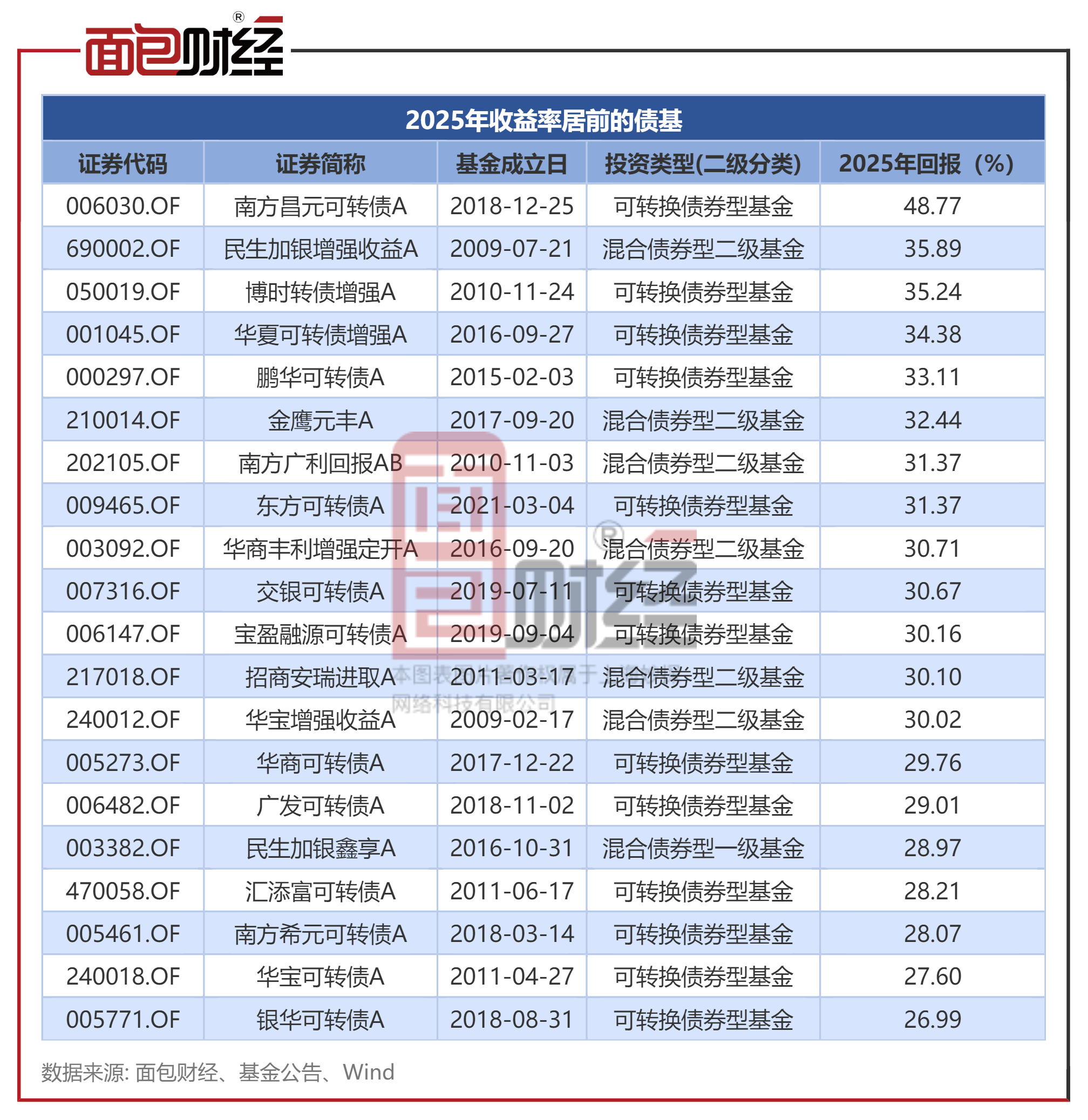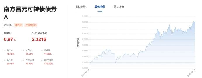 具体来看,南方昌元可转债A、民生加银增强收益A、博时转债增强A2025年年度收益在债券型基金中排名居前。包括前述产品在内,共有华夏可转债增强A、金鹰元丰A等13只债券型基金2025年收益率超过30%。