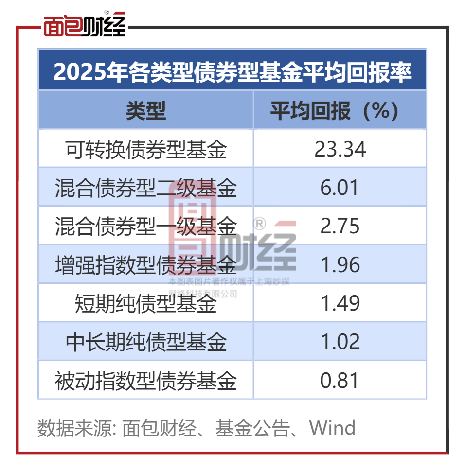 分类型来看,可转换债券型基金2025年表现较为领先,平均回报率达到23.34%。混合债券型二级基金、混合债券型一级基金表现位居其后,2025年平均收益率分别为6%、2.75%。