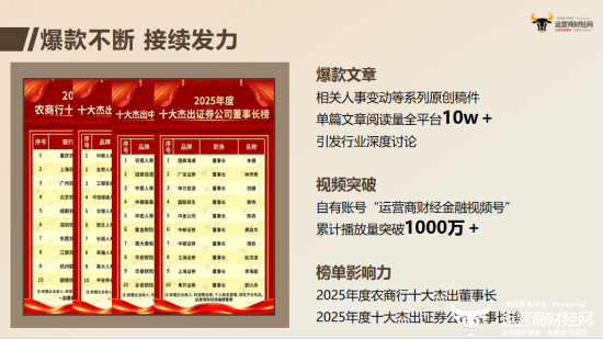 在榜单影响力层面,发布的系列权威榜单,例如,“2025年度农商行十大杰出董事长榜”“2025年度十大杰出证券公司董事长榜”已成为行业评价的重要参考。