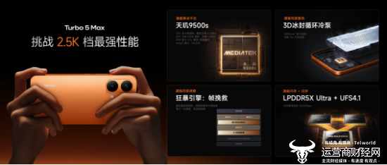 Turbo 5 Max 全球首发天玑 9500s,采用 3nm 制程工艺,第二代全大核架构设计,内置 8 核1+3+4三簇全大核 CPU 和 12 核 GPU。CPU 缓存 + 系统缓存达 29MB 超大规模,晶体管数高达近 300 亿,是真正的满血正代旗舰芯,实测安兔兔 V11 跑分超 361 万。
