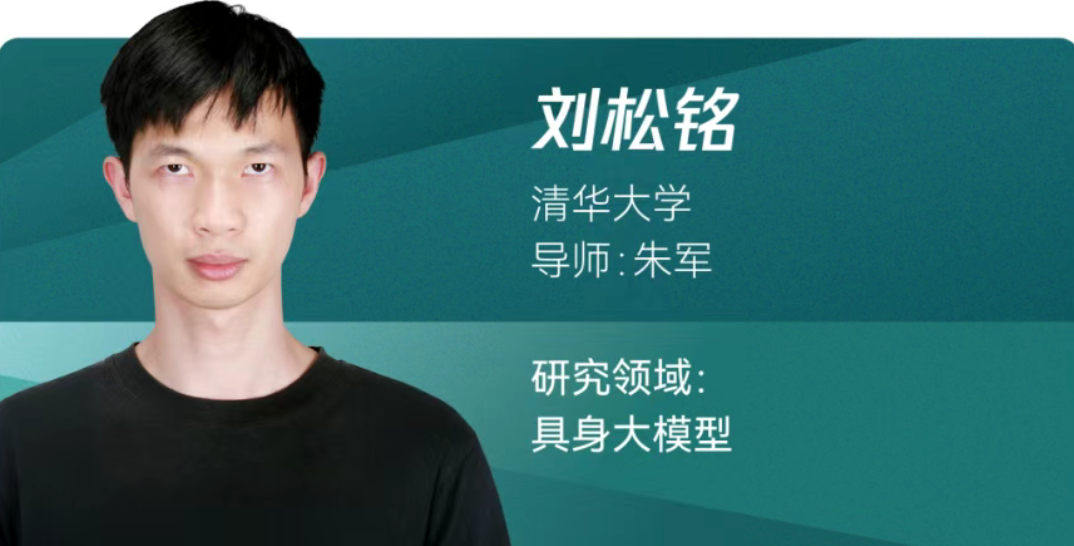 来自清华大学的刘松铭,致力于具身大模型方向研究,曾获清华本科生特奖,主导研发机器人基础模型 RDT 系列:RDT-1B (ICLR 2025) 获得 1600+stars,RDT-2 作为全球首个 UMI 无本体训练的 7B 大模型,支持任意机械臂零样本部署,实现接箭、打乒乓球等毫秒级动态操控。累计发表 12 篇文章,总引用量 1300+ 次。