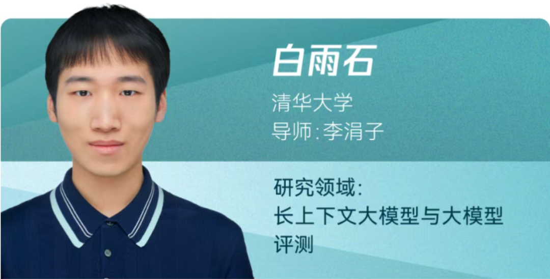 来自清华大学的白雨石,研究领域涉及长上下文大模型与大模型评测。截至目前,他已在 NeurIPS、ICML、ICLR、ACL 等国际顶会发表 10 篇一作论文,总引用量 4000 + 次,一作论文被引近 2000 + 次。开源的 LongBench、Long-Writer、LongAlign 等工作在 GitHub 共获 3000+ stars 及 300+ forks,在 HuggingFace 上开源的数据集和模型共被下载 200 万+ 次。