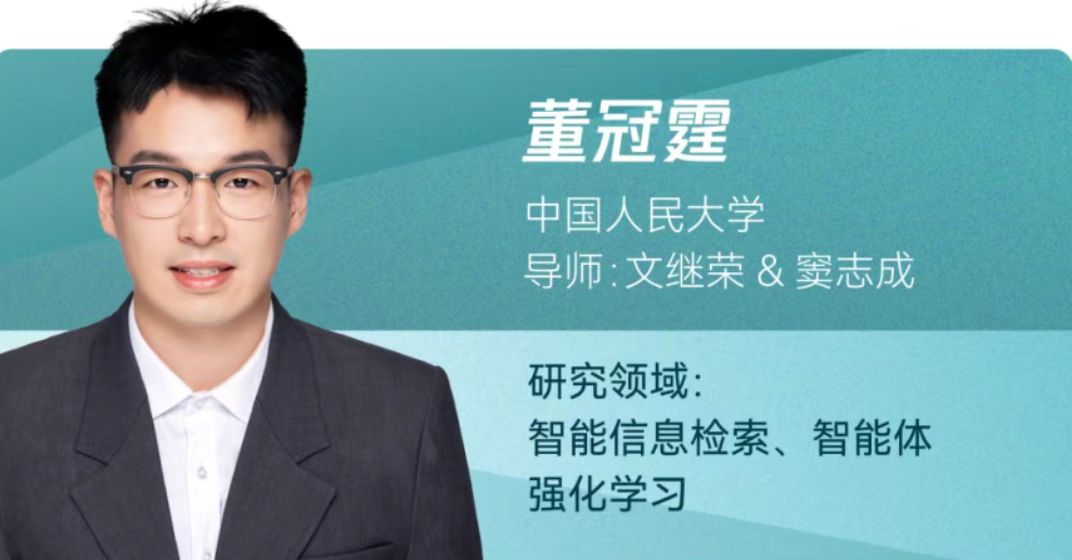 来自中国人民大学的董冠霆,主要研究方向为智能信息检索和智能体强化学习,曾获国家奖学金、北京市优秀毕业生等荣誉,并入选国家自然科学基金青年学生基础研究项目 (博士生)、中国科协青年人才托举工程博士生专项计划资助,代表工作包括 ARPO、AUTOIF.DMT、Search-o1、Webthinker、 FlashRAG 等, 受到国内外研究者的广泛关注。其中监督微调数据配比策略 DMT、自动化指令遵循对齐策略 AUTOIF 被落地应用于模型的对齐训练中。以第一 / 共一作身份在 ICLR、NeurlPS 等国际顶会发表论文 10 + 篇,谷歌学术引用量 1 万 + 次,GitHub 获得 8000+ stars。