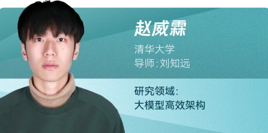 来自清华大学的赵威霖,研究领域是大模型高效架构,针对推理效率与长文本瓶颈进行探索,围绕高频词子空间提出了 FR-Spec,辅助投机采样实现更高效的并行生成,设计 InfLLM-V2 稀疏注意力架构,实现长短文本稀疏稠密的动态切换并获约 4 倍加速,相关成果已整合并开源至 CUDA 框架 CPM.cu。