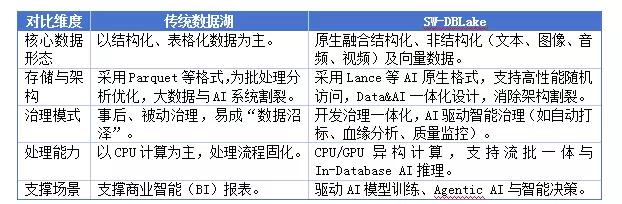 SW-DBLake的核心定位,是成为AI时代面向多模态数据的统一治理底座。它从根本上重构了数据的存储、管理和处理方式,有效解决了传统数据架构在多模态、智能化场景下长期存在的治理困境,相较于传统数据湖,SW-DBLake有如下能力提升。