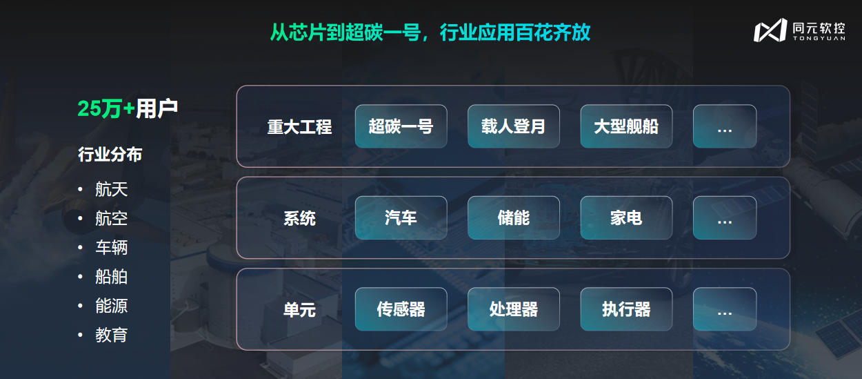 如今,MWORKS 已积累超25万用户,覆盖航天、航空、车辆、船舶、能源、教育等多个行业,从传感器、处理器等基础单元,到汽车、储能等系统级应用,再到 “超碳一号”、载人登月、大型舰船等国之重器,MWORKS应用百花齐放,展现出了强大的技术支撑力。
