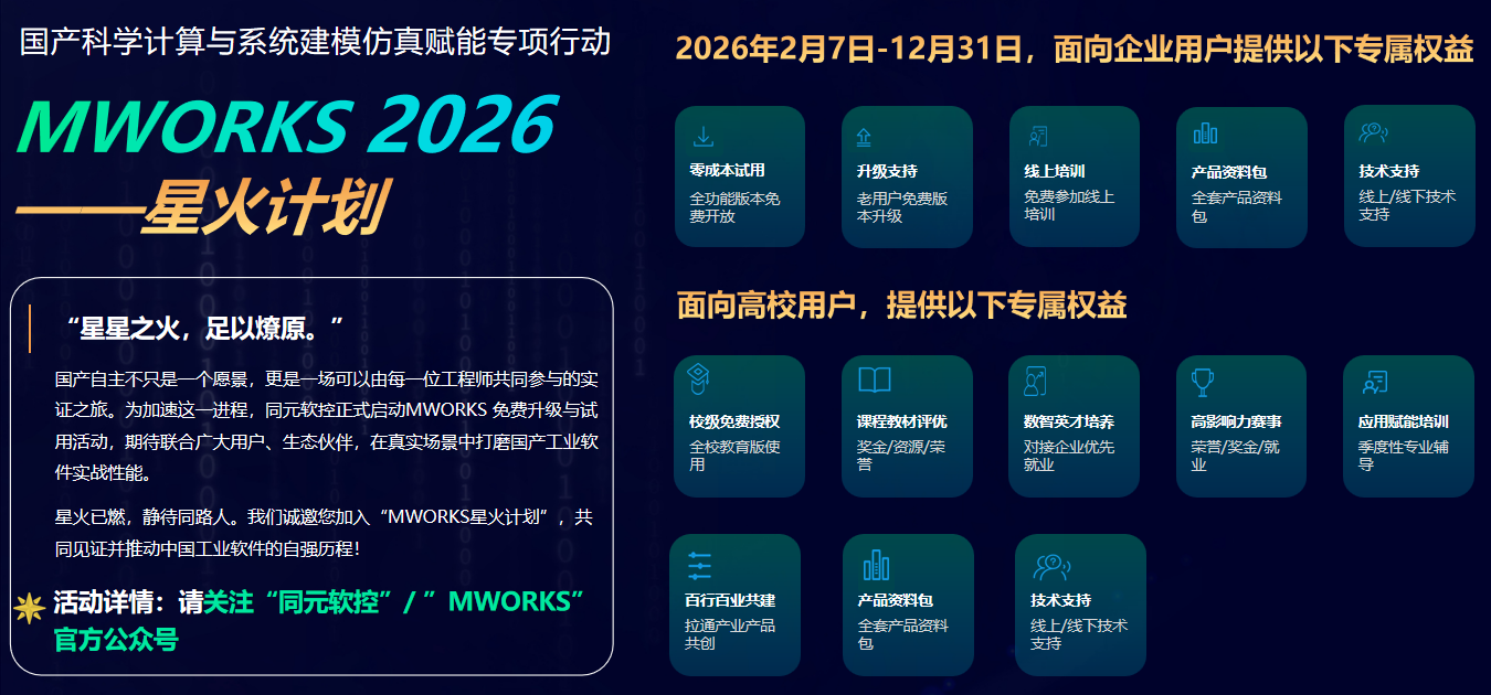 2026a 的正式发布,标志着MWORKS平台迈入全新发展阶段。未来,同元软控将持续深化 “MWORKS NEXT” 技术战略,以工程化、数字化、智能化核心能力为根基,凝聚更多知识沉淀与产业实践经验,携手产业伙伴、高校院所与开发者,推动工程级CPS一体化平台向更多行业深度落地,助力广大用户从“功能可用”进阶至“工程高效”,共筑自主可控的工业软件新生态。
