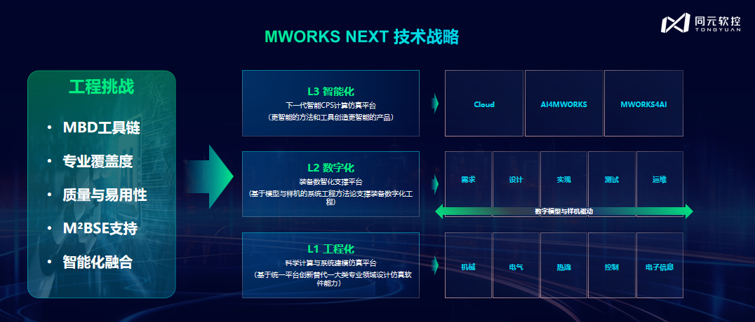 发布会上,郭俊峰重点阐释了“MWORKS NEXT ”技术战略。这一战略针对MBD工具链补齐、专业覆盖度建设、质量与易用性提升、M²BSE支持及智能化深度融合等工程挑战,提出了 “工程化、数字化、智能化” 的三层进阶体系。